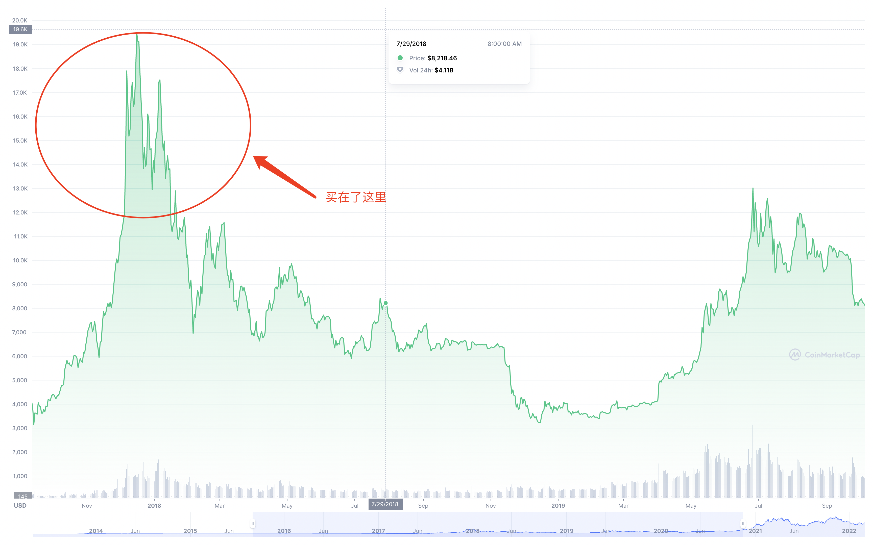 我们来举个例子,比特币是足够好的资产对吧,那么如果你买在这里:这是比特币2017年到2019年底价格。