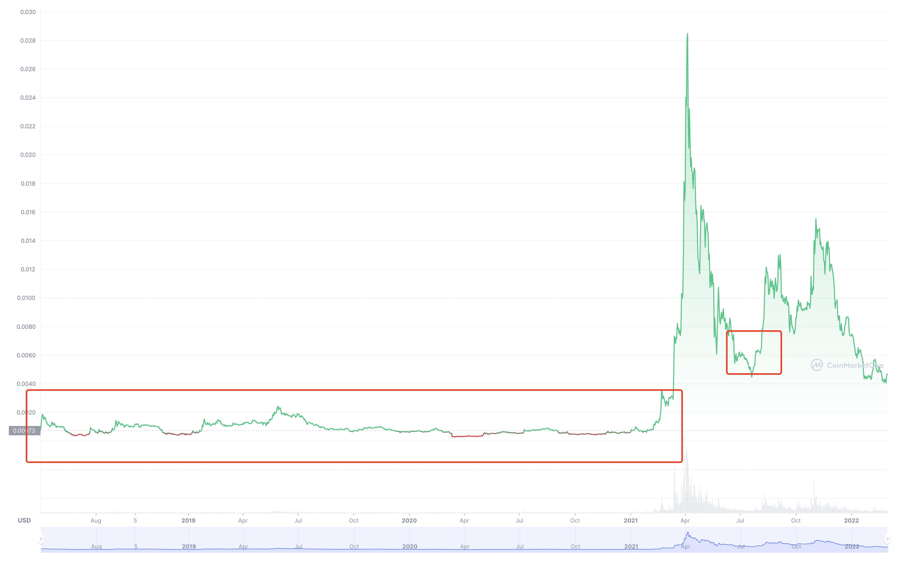 那我么在来看一个不怎么好的资产:这是一个可能大家没怎么听过的币种holochain从2018年5月到2022年2月底的价格图。我们可以看到,他相比于比特币并不是那么好的资产,最起码他不够好。