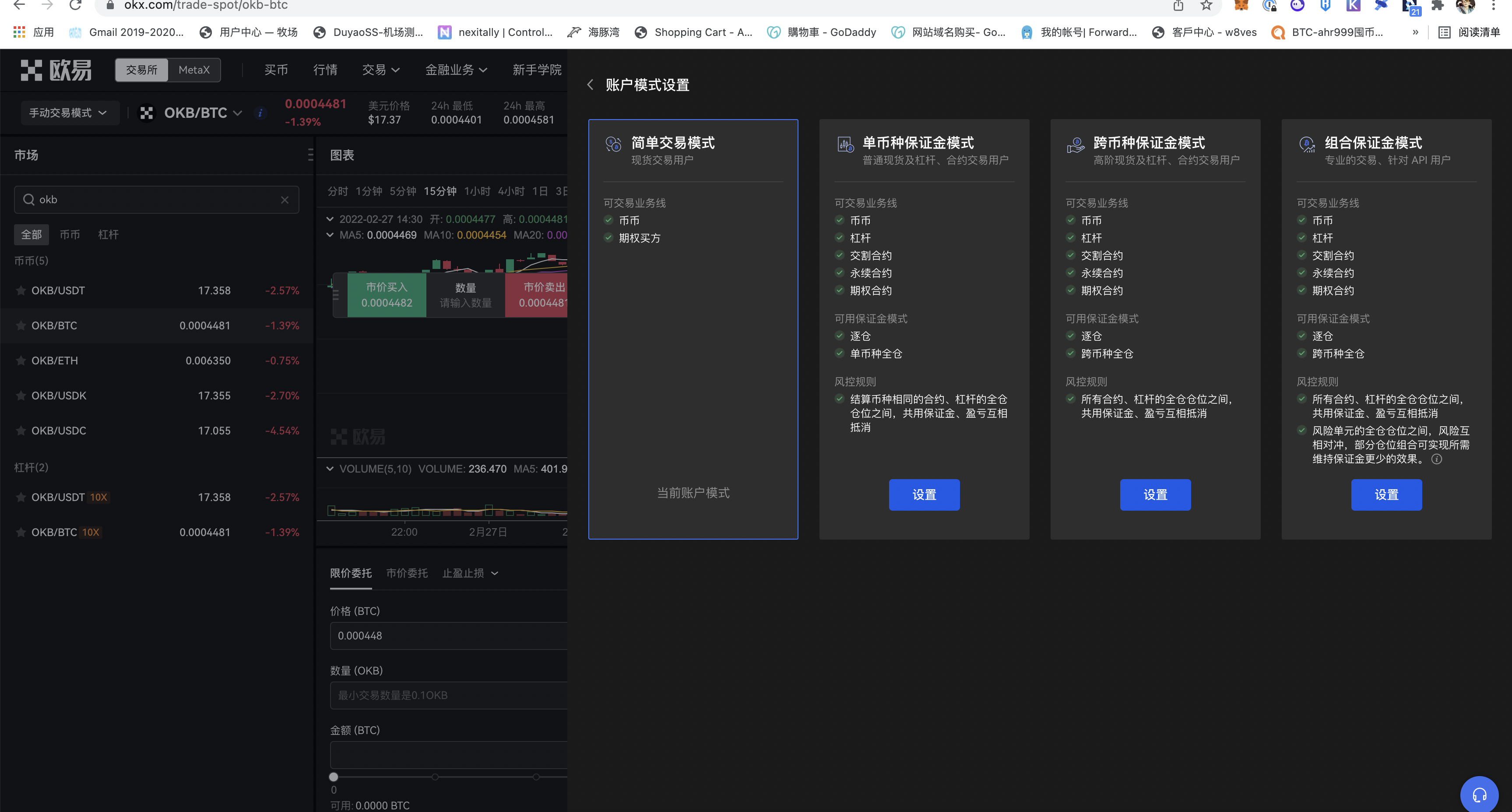 我们可以看到有四种交易模式,最开始就是简单交易模式,如果你没有5万美金的资产,就用单币种保证金模式也可以,如果你有5万美金,可以换成跨币种保证金模式