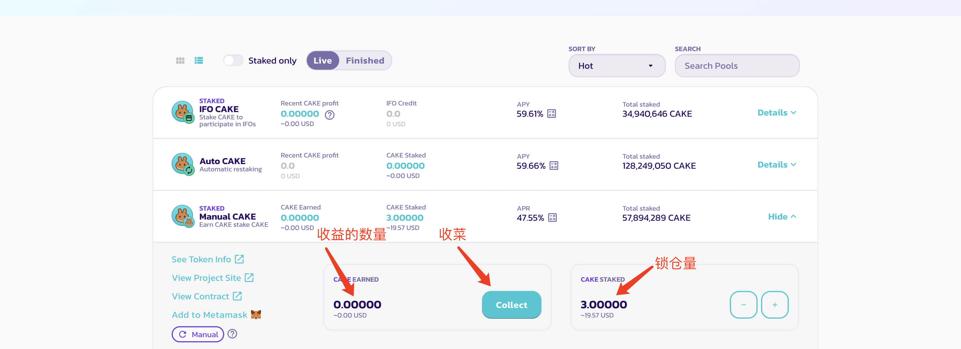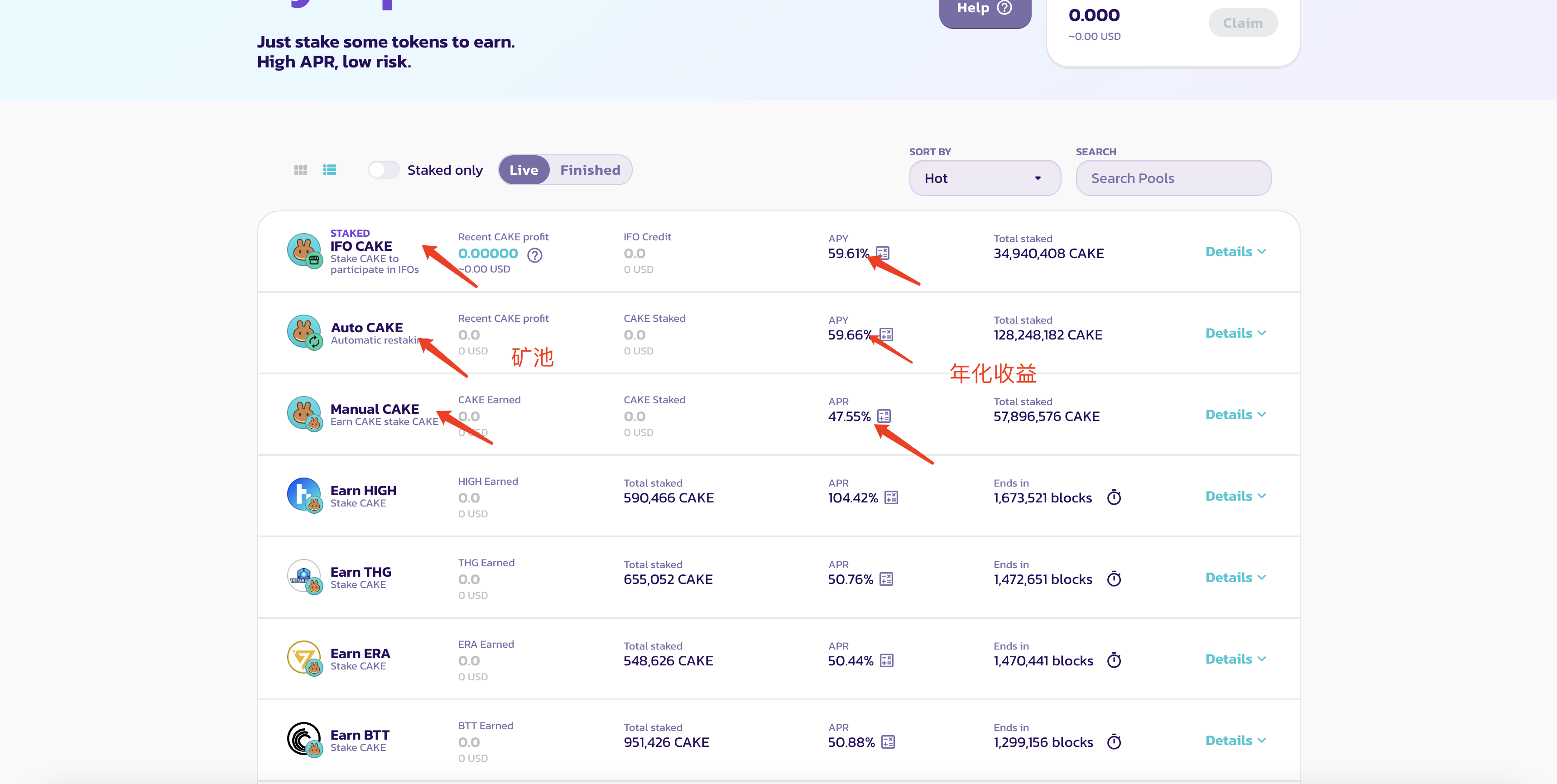 然后我们可以看到有一个个的矿池和收益,这三个矿池都是用cake去挖cake的,说的简单一点就是,你把cake存进去,他给你cake作为利息,只要收益能cover过利息,就是纯赚的。