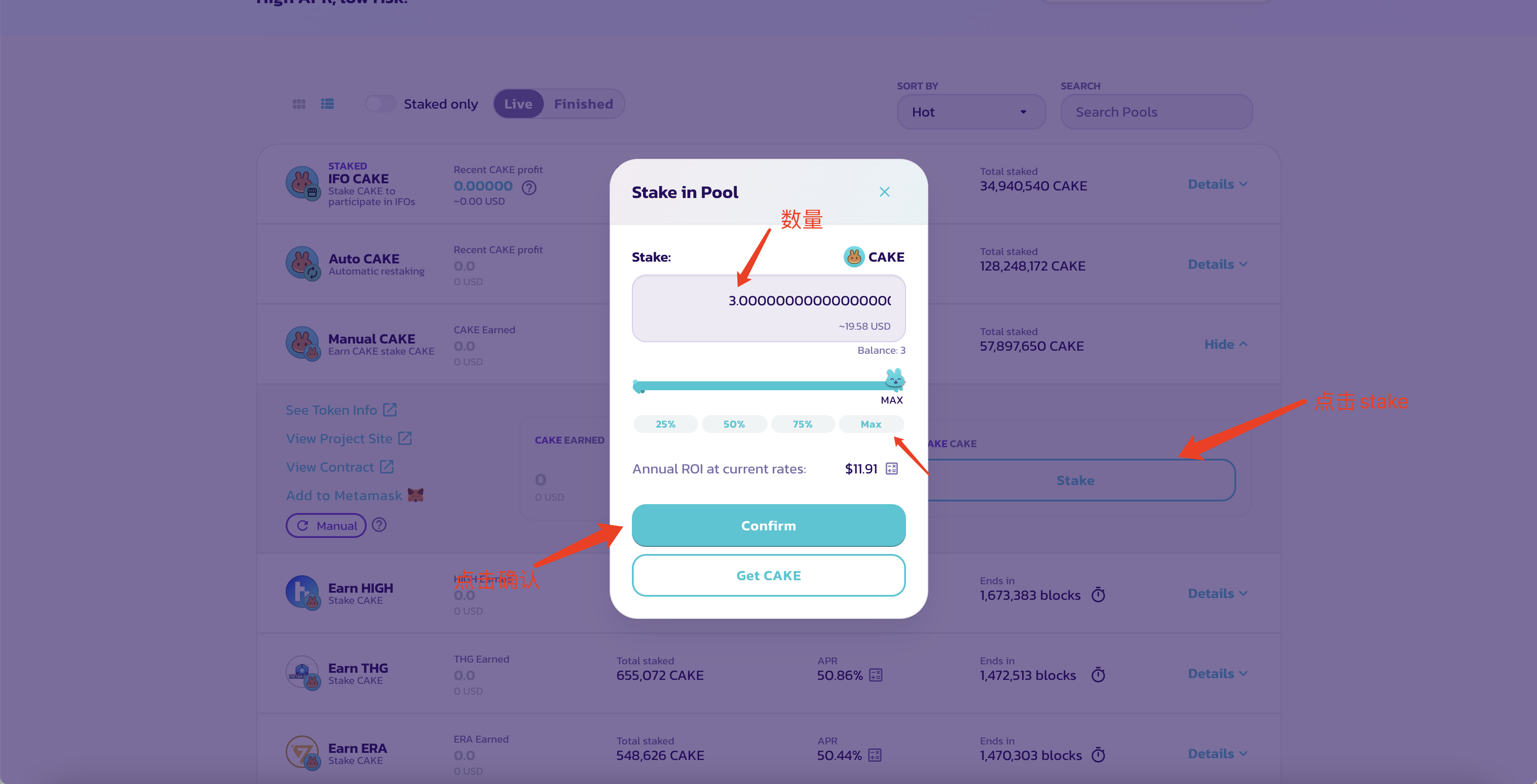 所以我们选怎第三个,manual cake,点击矿池,然后选择存进去的数量。点击确认,然后在钱包确认。