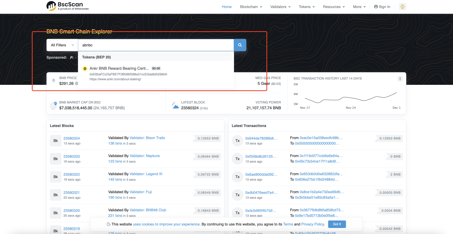 比如我们看到abnbc,并且知道这是在bsc链上出现的套利机会,那我们就确定了在bsc链上,然后我们第一步先去找到区块浏览器,bsc的区块浏览器是: