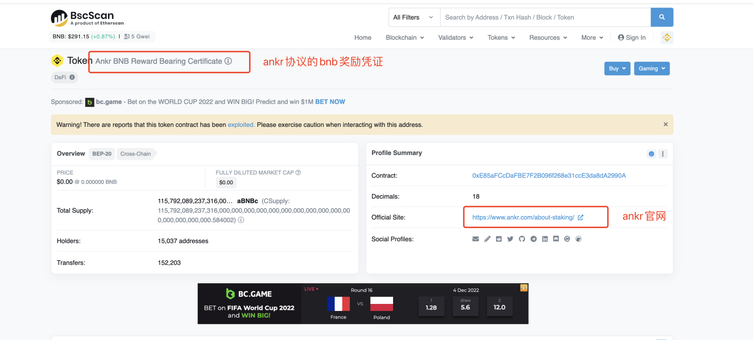 可以看到出来了一个代币,我们点进去查看一下,我们可以看到两个信息,第一是,这个代币是干什么的,abnbc是在ankr协议上使用的,其实就是类似于beth或者是steth一样的东西。