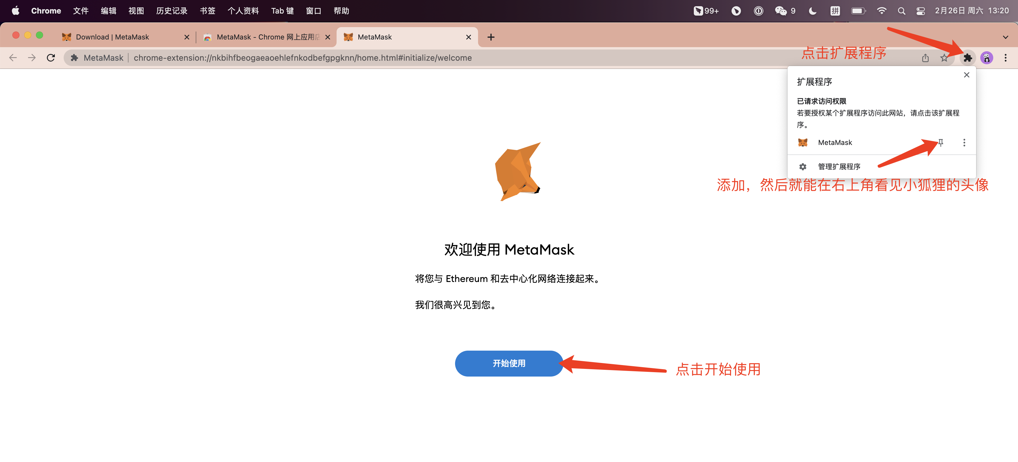 然后点击扩展添加小狐狸,然后点击开始使用: