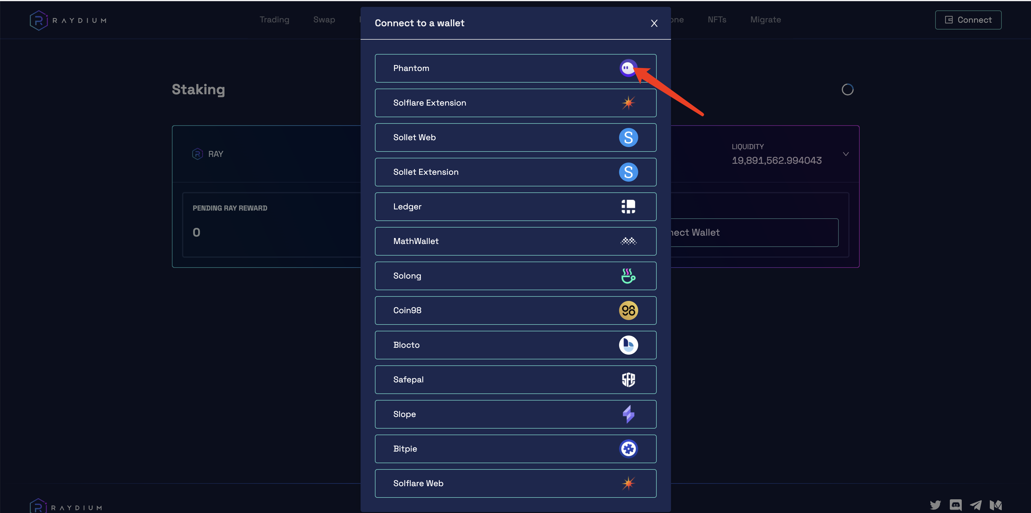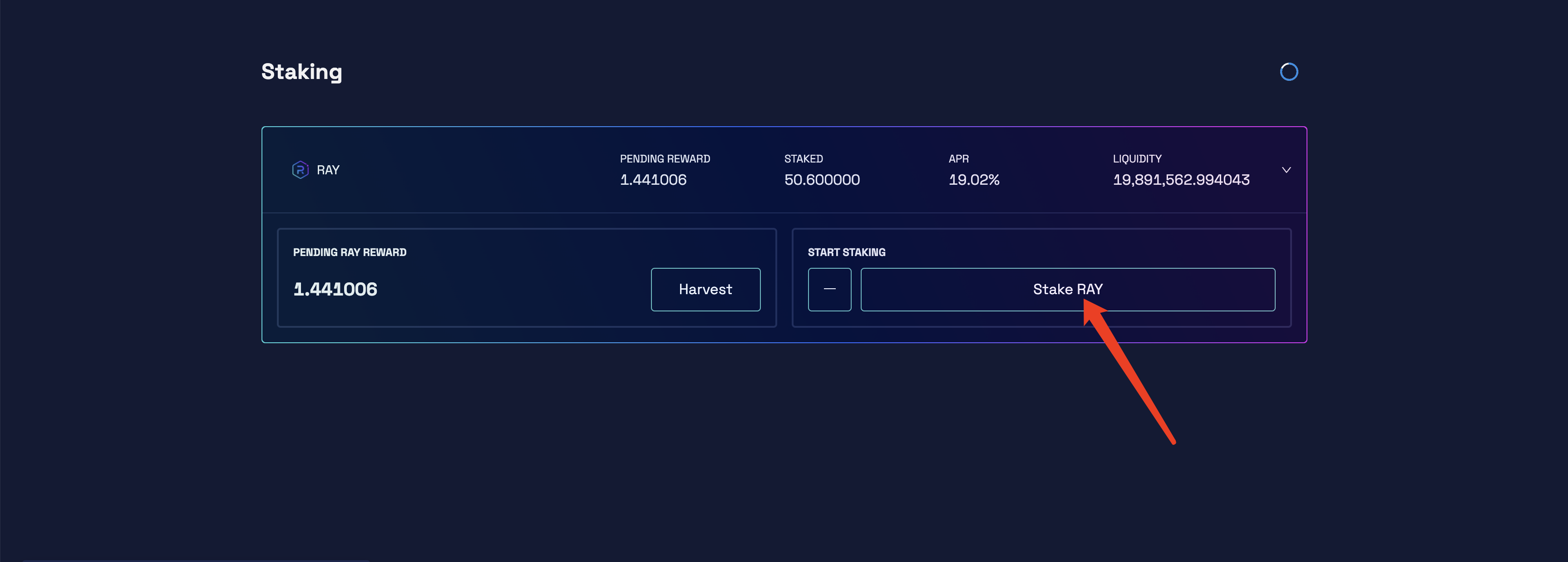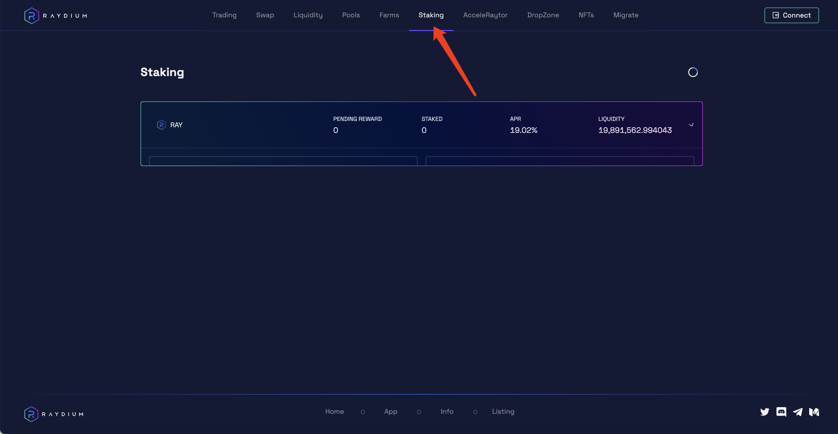 当我们设置好钱包以后,打开网址:https://raydium.io/staking/